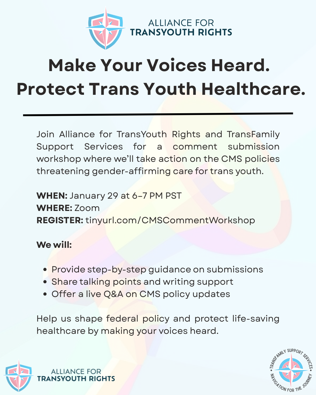 Join TransFamily Support Services and the Alliance for TransYouth Rights on January 29th from 6–7 PM PST for a virtual Public Comment Submitting Session in response to recent CMS (Centers for Medicare & Medicaid Services) news released in December that may impact access to gender-affirming care and protections for trans and nonbinary youth.