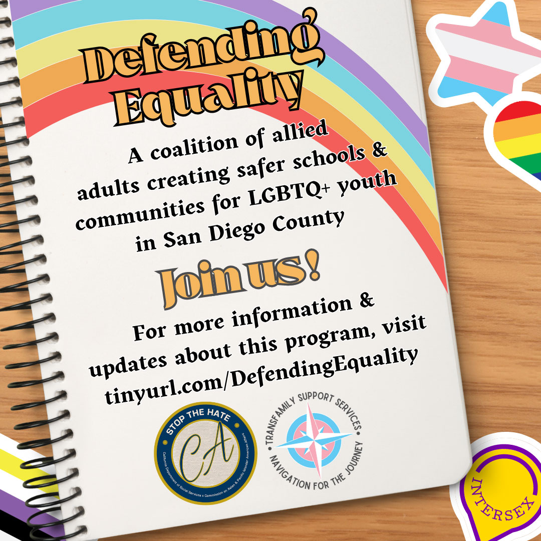 We need YOUR help to protect the rights of LGBTQ+ students in San Diego County! Our new program, Defending Equality, is urgently seeking passionate allies to stand with us in advocating for inclusive and safe school environments.